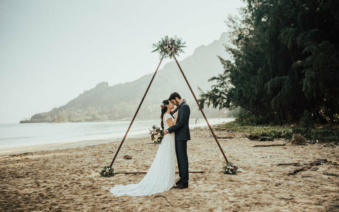 bride-wearing-dreamers-and-lovers-catherine-dress-with-train-hawaii-beach-weddings
