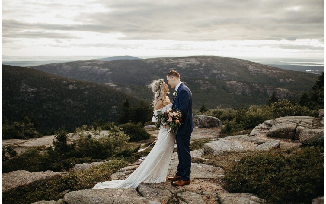 Boho-wedding-at-acadia-national-park-bride-wearing-off-the-shoulder-lace-gown