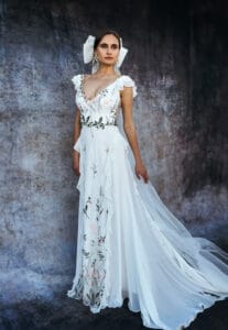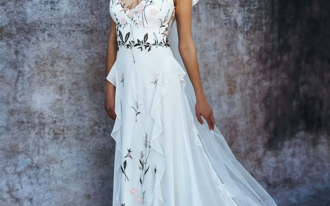 Lily-crepe-and-lace-colored-wedding-dress-flowy-and-romantic-with-ruffles