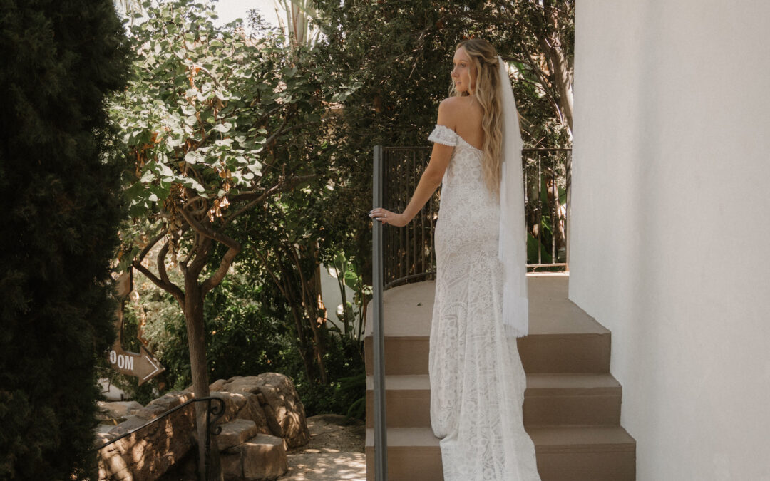 Bohemian-Bride-wearing-off-the-shoulder-fitted-Boho-Lace-Wedding-Dress