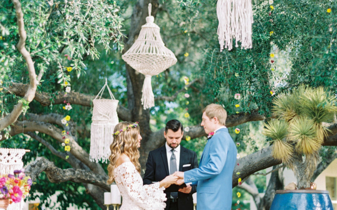 boho-bride-wearing-off-shoulder-lace-wedding-dress-with-bell-eleeves-in-her-backyard-bohemian-wedding