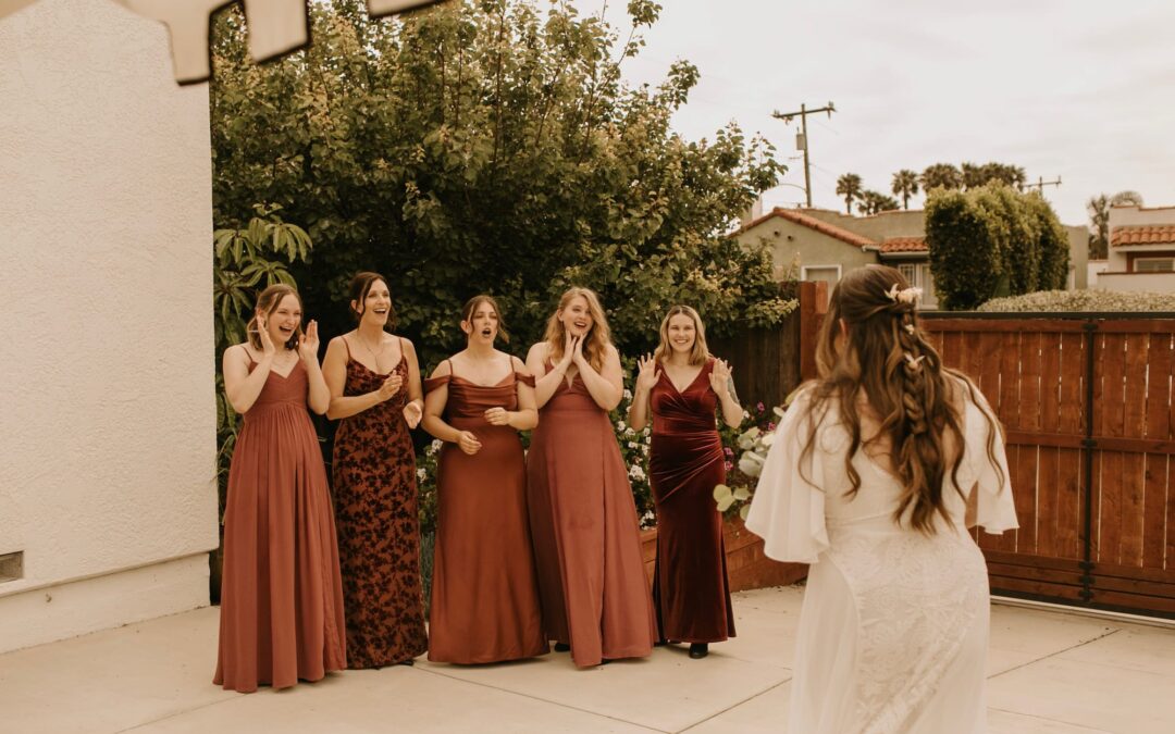 Phoebe intimate wedding and bridesmaids wearing terracotta