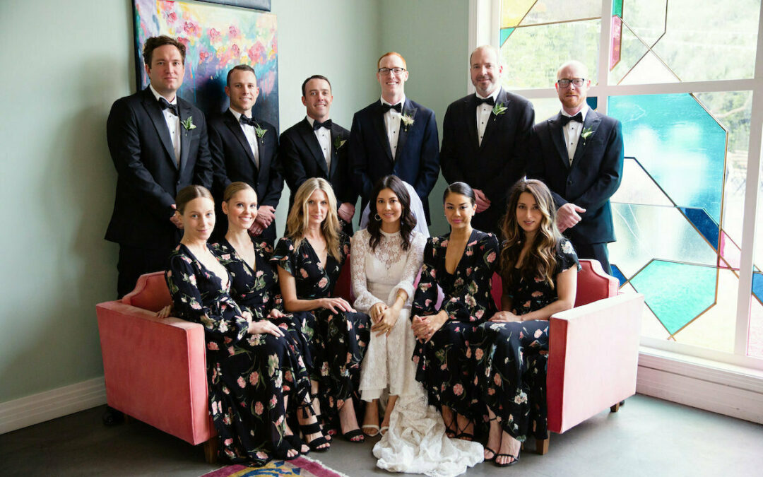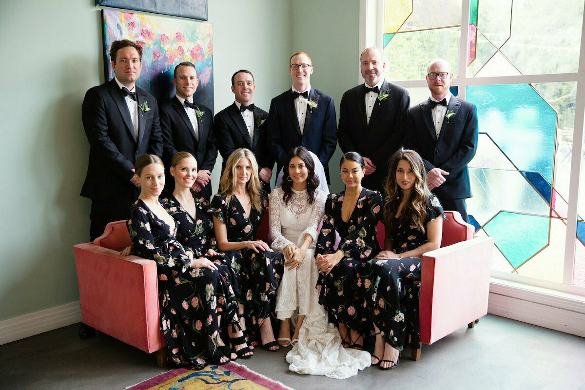 bridesmaids-in-black-floral-dresses-with-the-bride-in-her-off-white-lace-wedding-dress
