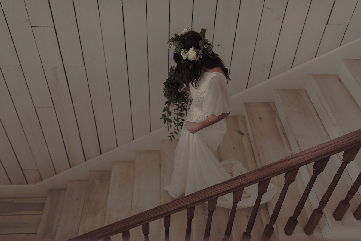 bride-saran-walking-down-the-stair-wearing-a-flower-crown-and-her-boho-wedding-dress