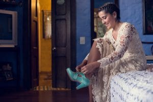 Amalia-wearing-isis-bohemian-wedding-dress-and-blue-vintage-shoes