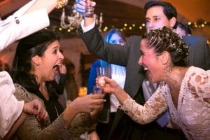 bride-and-wedding-guests-taking-shots-wearing-lace-dress