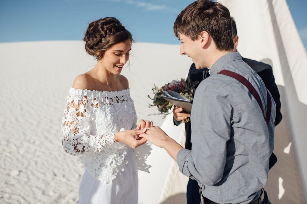 boho-bride-Malia-wearing-off-the-shoulder-crochet-lace-top-with-silk-skirt-wedding-elopement