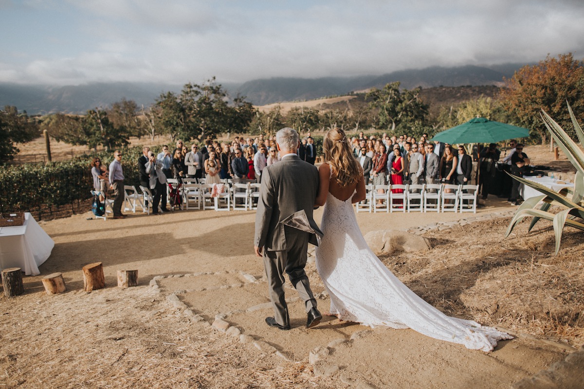 a-laidback-bride-faces-her-wedding-guests-as-she-walks-with-her-father-at-her-California-ranch-wedding