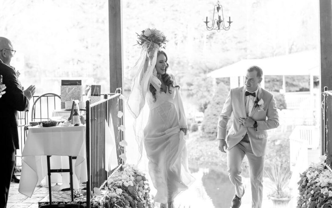 Bride-wearing-bell-sleeve-silk-wedding-dress