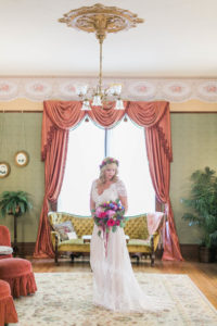 bohemian-bride-Caitlin-wearing-Azalea-vintage-inspired-lace-dress-carrying-a-colorful-bouquet
