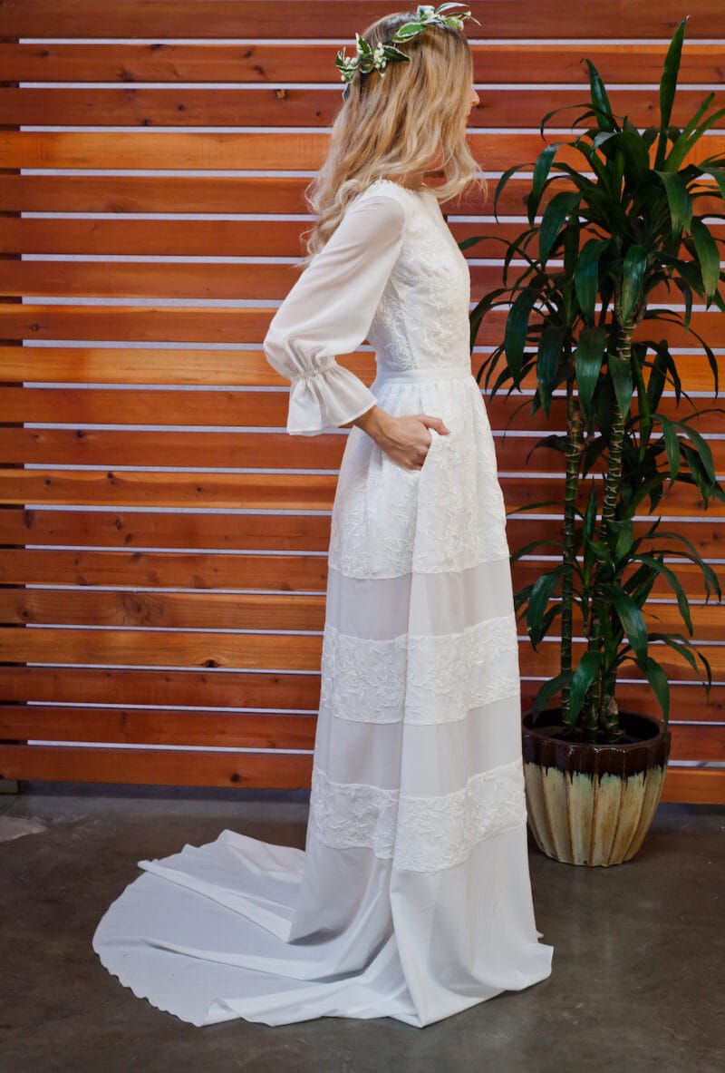 Each lace wedding dress is made-to-order in our California design studio using unique cotton lace textiles. From flowing bohemian to fitted modern styles, handcrafted for brides seeking something beautifully different.