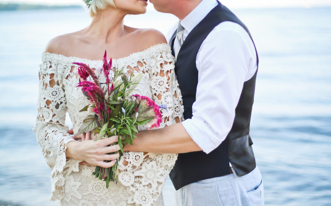 bohemian-beach-wedding-inspiration-bride-wearing-boho-lace-wedding-dress-off-shoulder-style