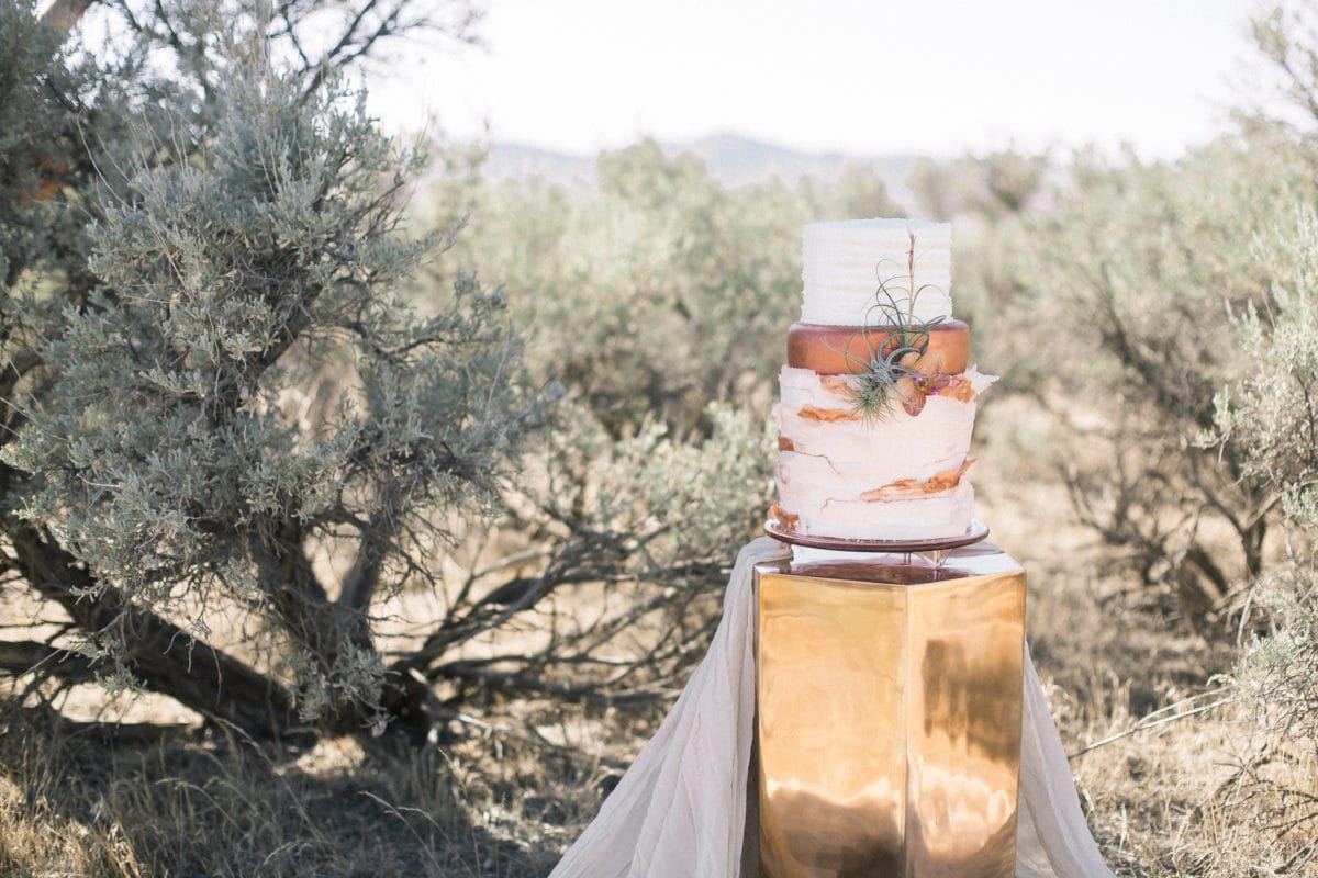 earthy-wedding-cake-inspiration-on-a-copper-stand-with-flax-natural-cotton-cloth-nestled-in-the-mountains