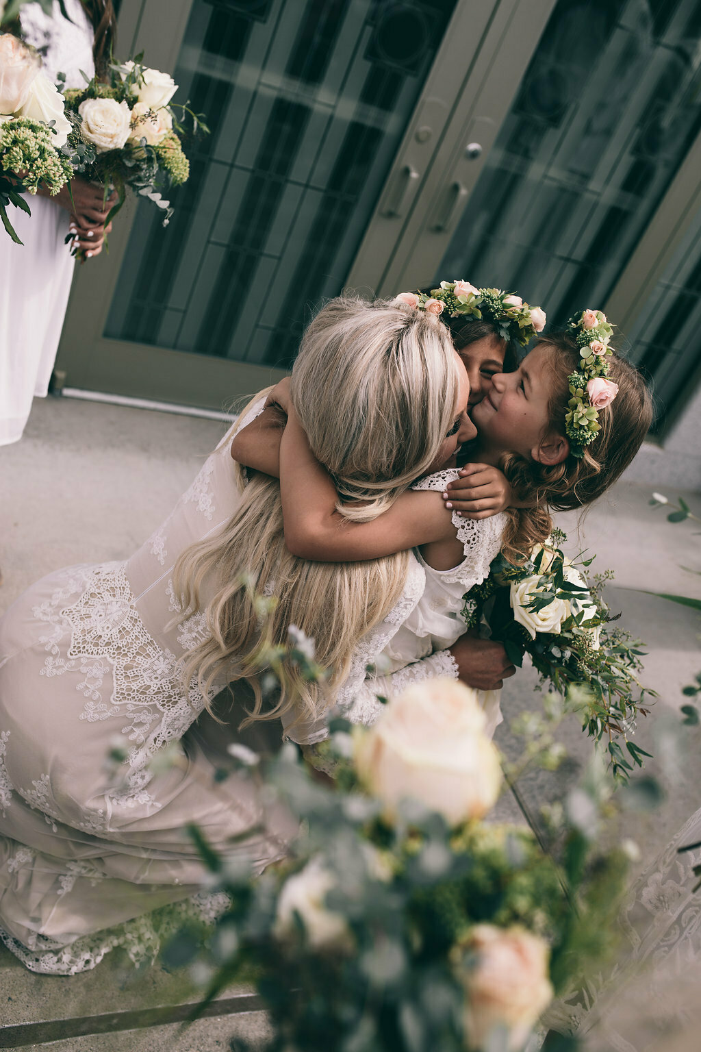 bride-lizzy-sharing-a-hug-with-her-bohemian-flower-girls-wearing-boho-white-and-green-simple-flower-crowns
