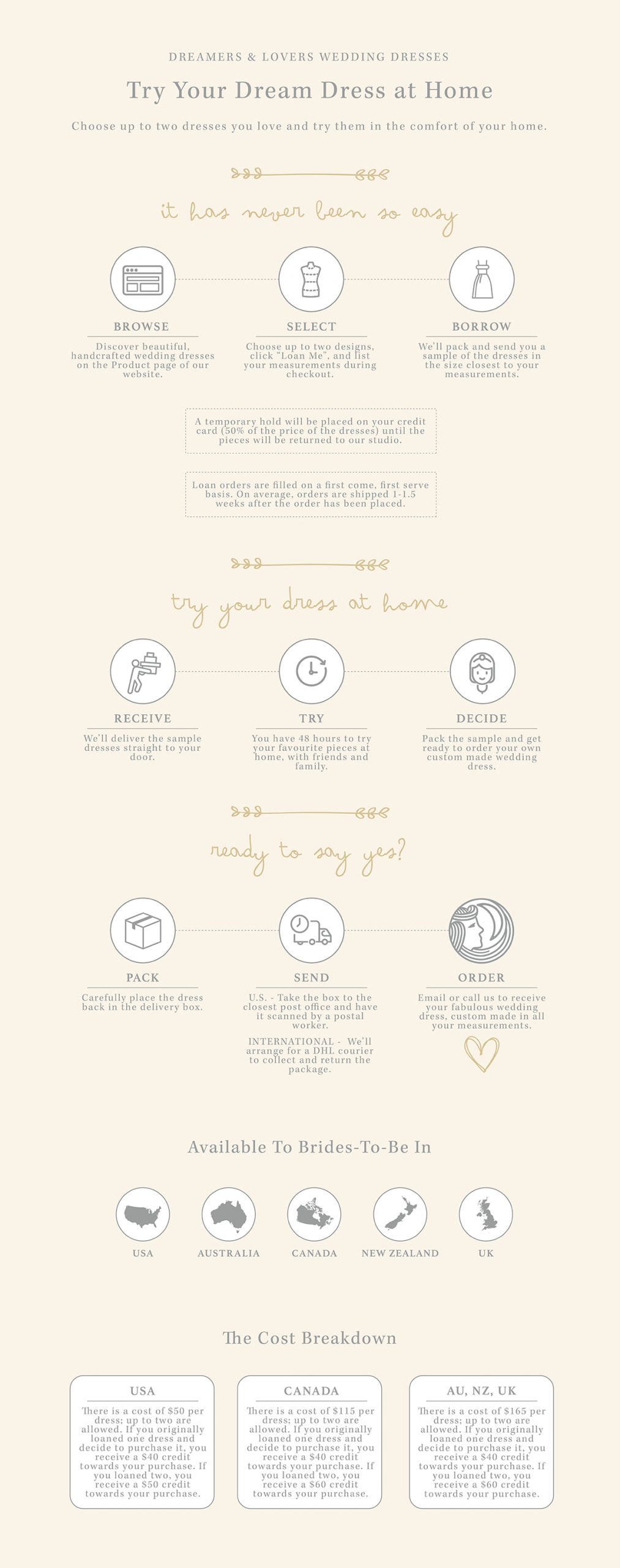 Home Try-on fees are non-refundable. You can cancel a home try-on order before it is shipped. We offer a complimentary home try-on fee credit if you order one of the dresses within four weeks of receiving the sample. Full information can be found under the home try-on FAQ.