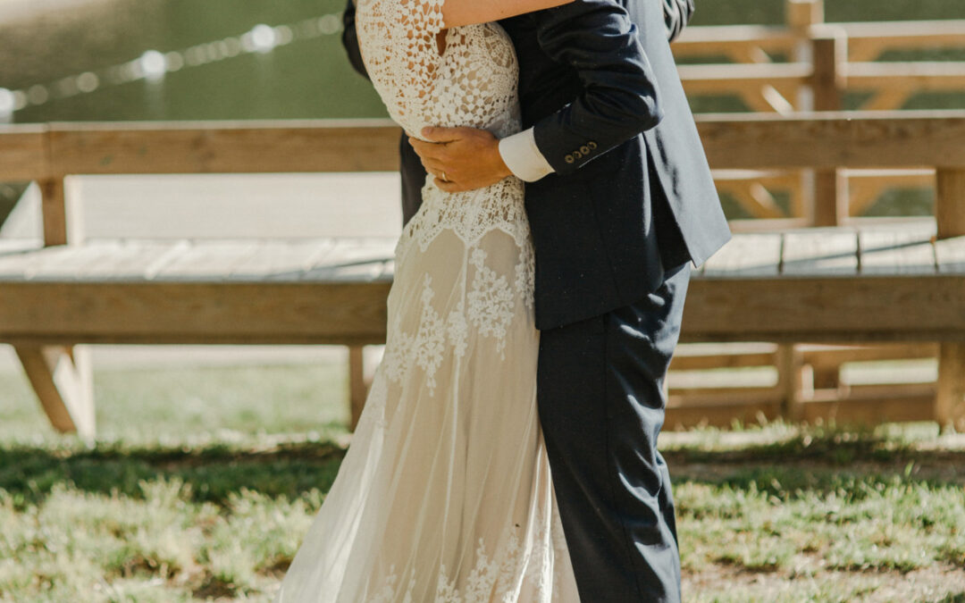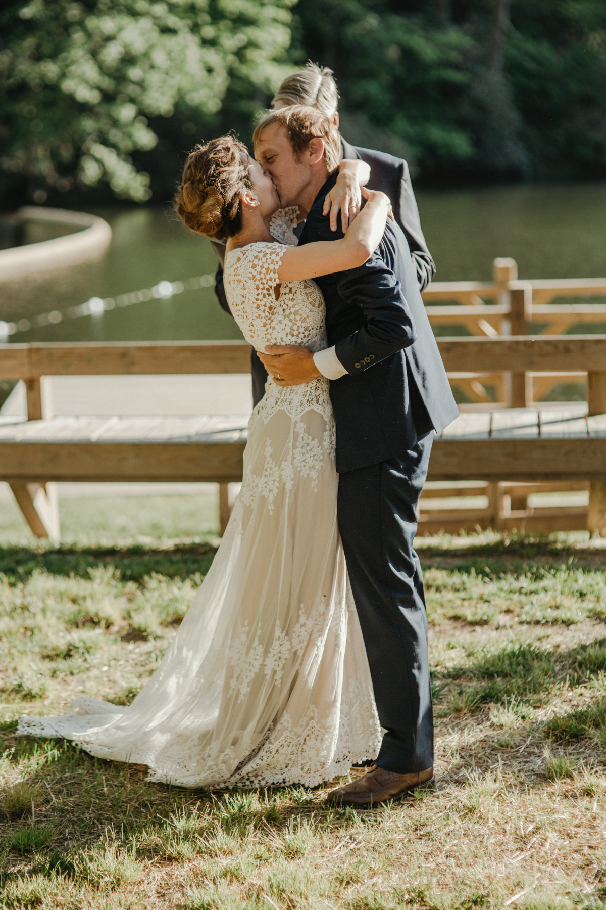 bohemian-couple-steal-a-kiss-at-their-laidback-camp-wedding-ceremony--she-wears-the-azalea-handmade-lace-wedding-dress
