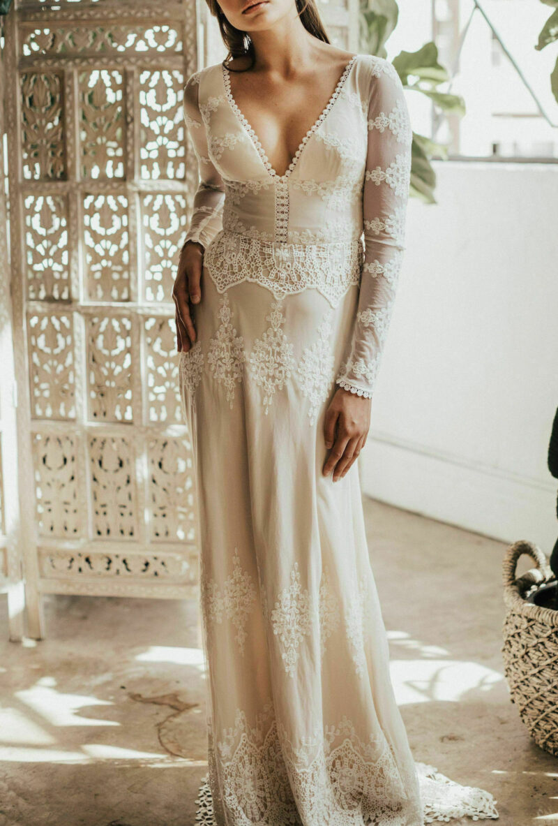 Long Sleeve Open Back Wedding Dress with Deep V Neck