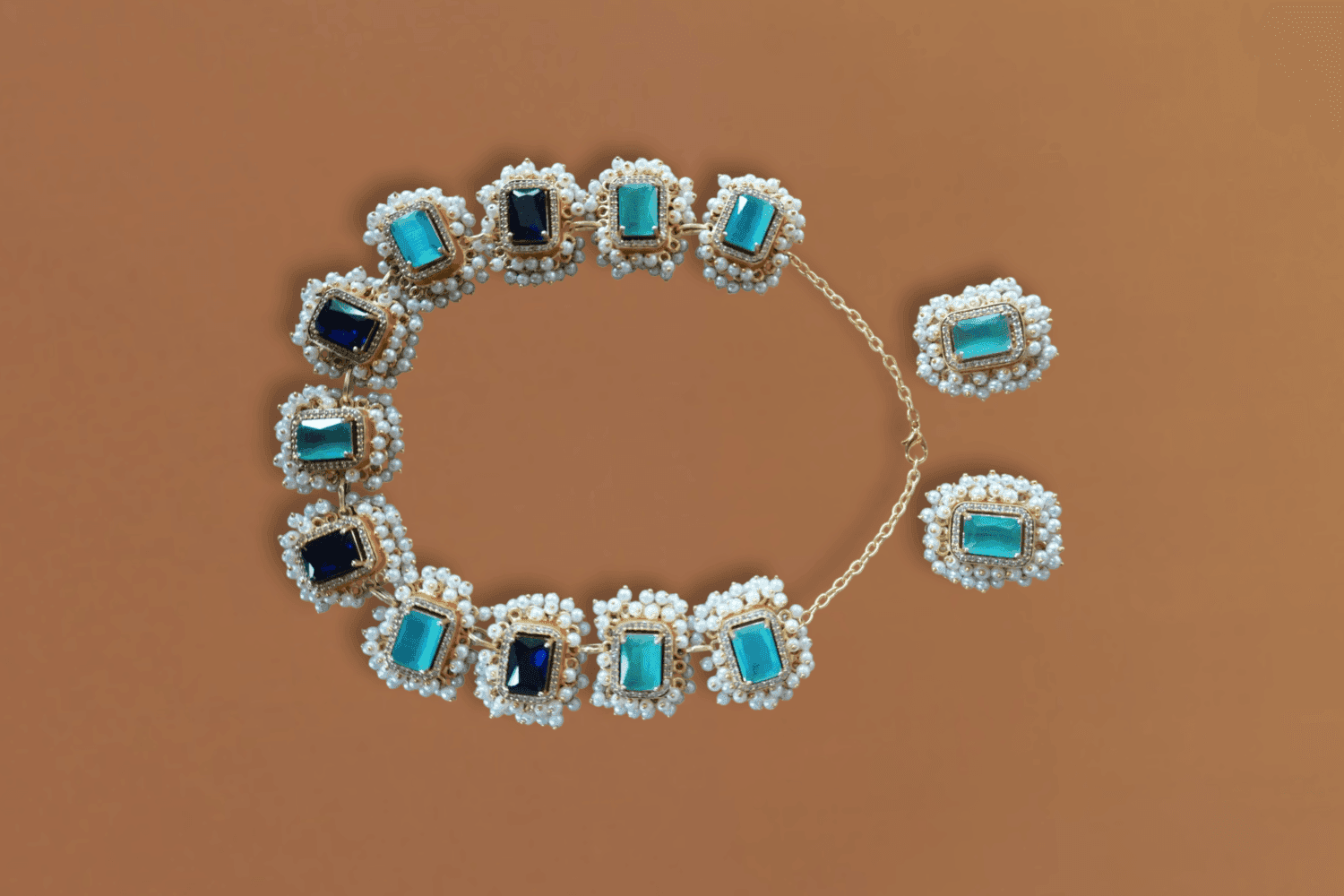 The Celestine Pearl Choker Set – Inspired by the celestial beauty of the sky and sea, reflecting the divine nature of pearls and gemstones. Drift into a world of timeless beauty with the Celestine Pearl Choker Set, offered in two exquisite colorways, Oceana and Aurora. This breathtaking fusion of old-world charm and modern artistry is designed for the bride who dares to stand out. This handmade pearl choker and matching earrings express elegance, grace, and individuality. Each choker features 11 large, hand-selecte