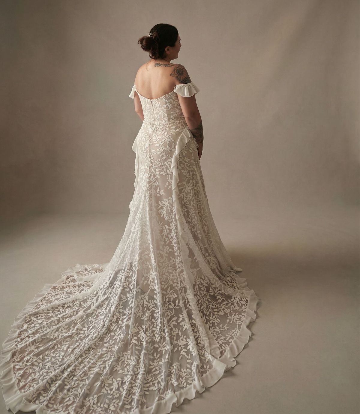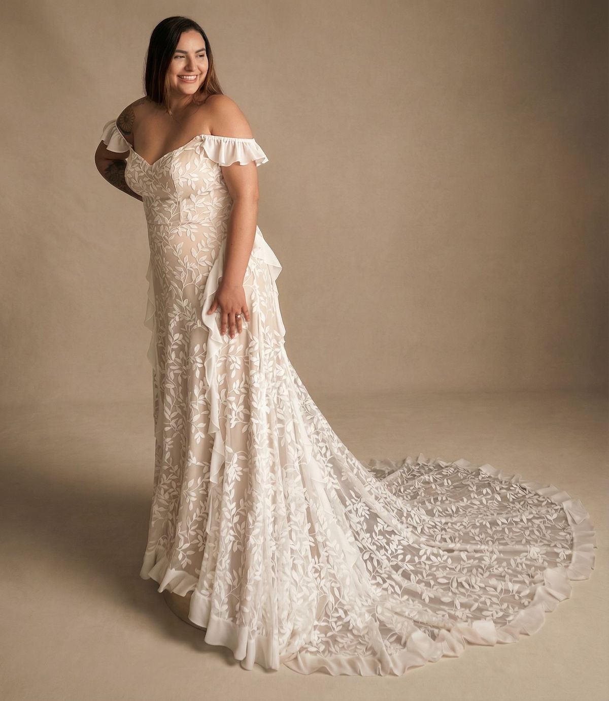 The silhouette begins with the magical allure of exposed shoulders, which curve down to a delicate, sheer ruffle sleeve that ends above the elbow and promises to be a cool contender for even the warmest summertime wedding.