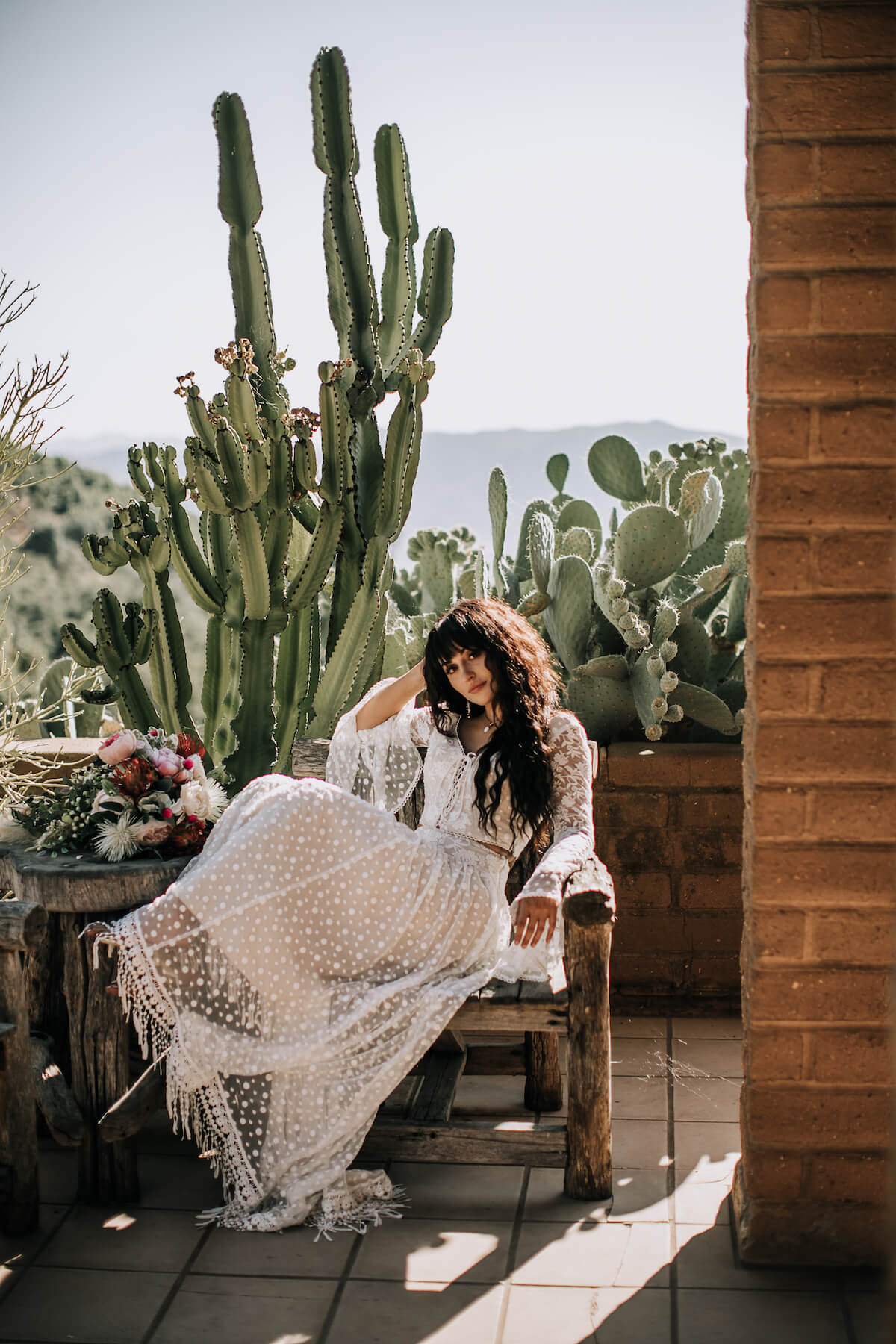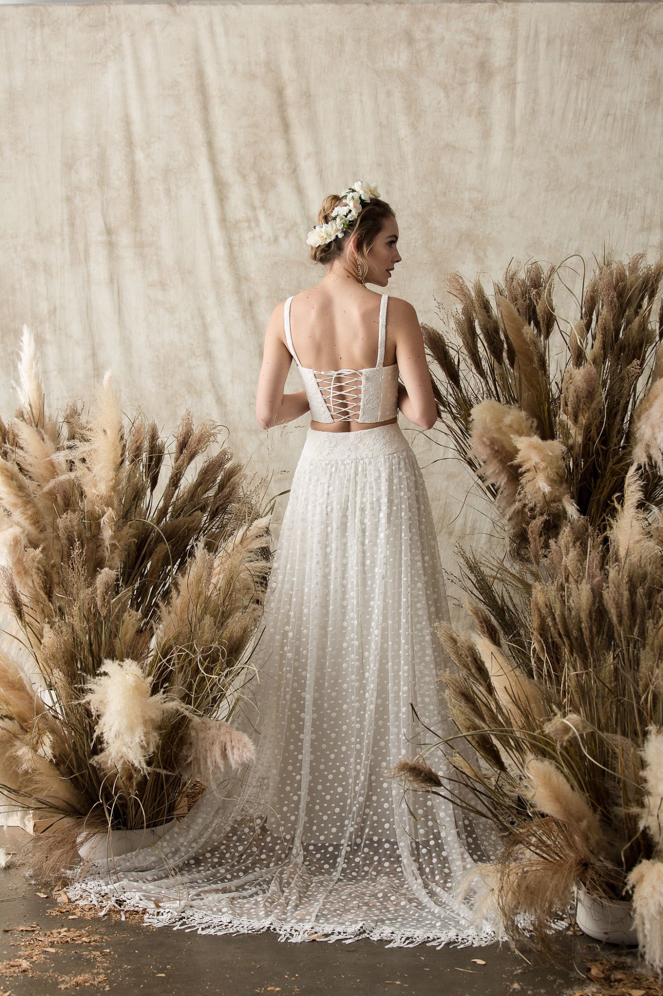 The Ophelia boho wedding dress is a playful tribute to free spirited lovers and comes with a choice of two bodices: one for the warmer months and one for times when their might be a chill in the air…both, of course, bearing a sliver of midriff for good measure. (if you choose, that is) The Ophelia tops can be custom made to not show any midriff. This is for the confident bride who doesn’t need to wear a dress to make a statement on her wedding day. One of our favorite feature of this dress is the whimsical dotted lace. This lace is only available at Dreamers & Lovers.