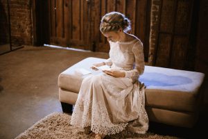 bride-sadie-reading-her-vows-pre-wedding-ceremony-wearing-dreamers-and-lovers-lisa-lace-bohemian-wedding-dress