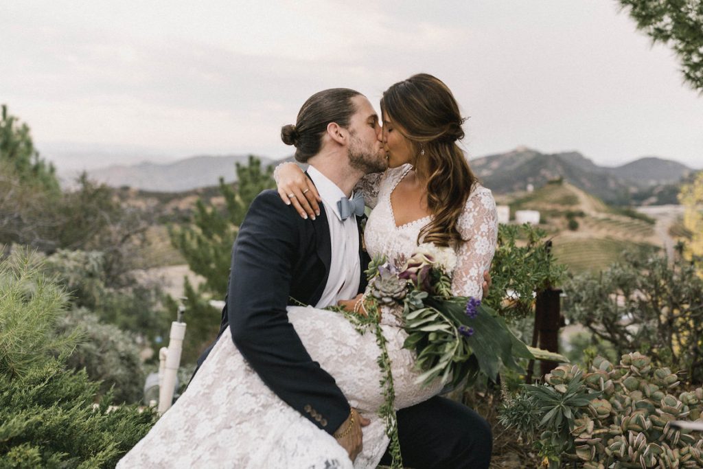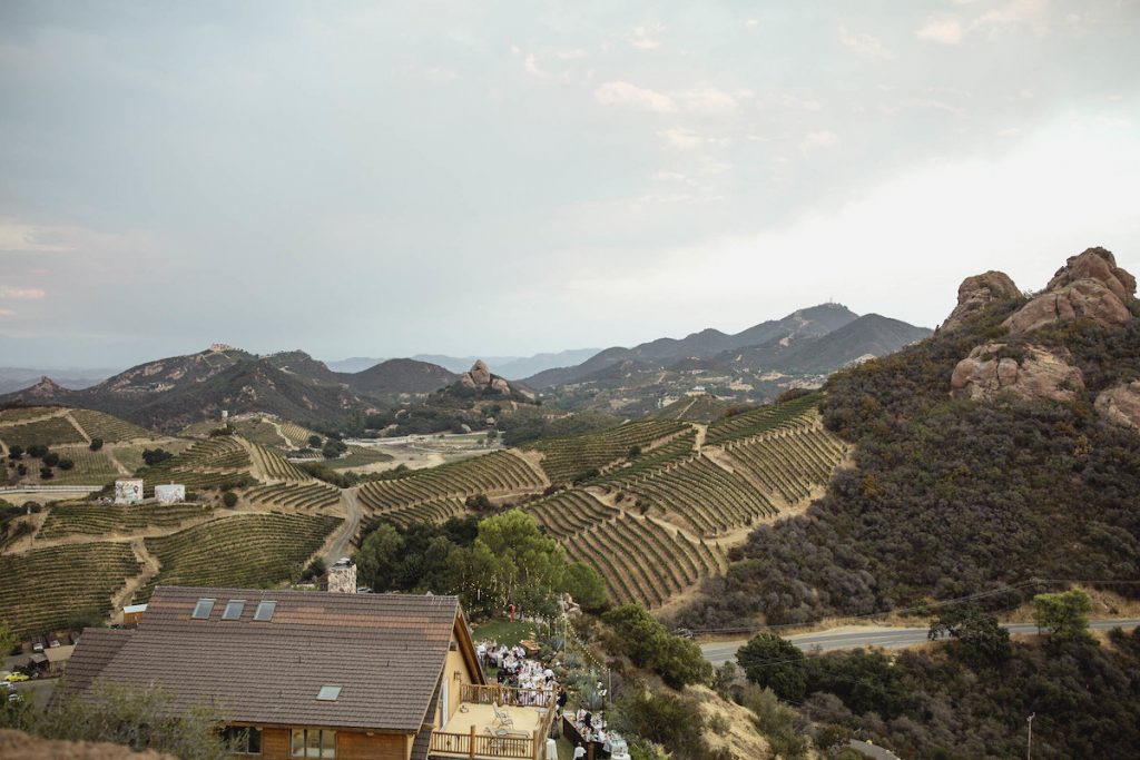 The lovers invited 125 guests to the event, which was booked at Saddlerock Ranch and Hilltop Estate, a beautiful log cabin on top of the mountains, with views of the vineyard, rolling hills and the ocean (the mountains and the sea, remember…) and while the venue couldn’t have been better chosen, planning was intense, since they had to bring everything themselves…down to the kitchen utensils. The ceremony and reception were held outside the cabin, perfect.