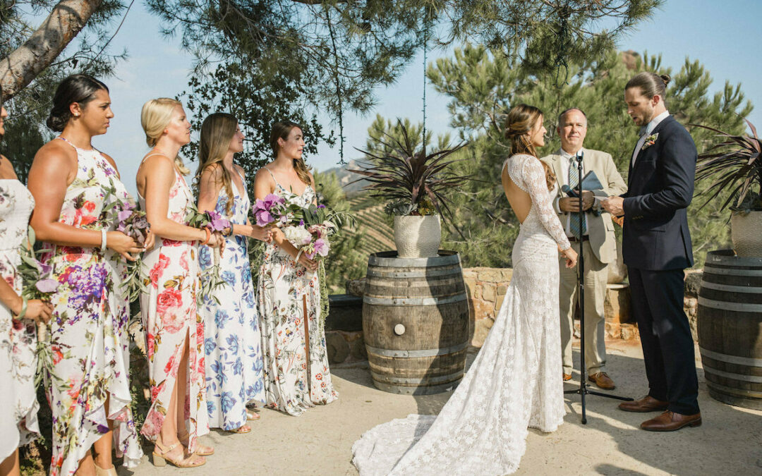 magical-ceremony-at-saddlerock-ranch-bridesmaids-wears-floral-dresses-bride-wearing-a-long-sleeve-backless-lace-wedding-gown