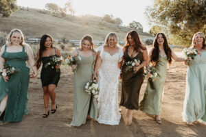 Bride Shila wearing Kelly Whimsical Wedding Dress with her bridesmaids in green