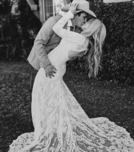 Real bride Breana wearing the Violetta bohemian lace wedding dress by Dreamers & Lovers during her Western-boho wedding.