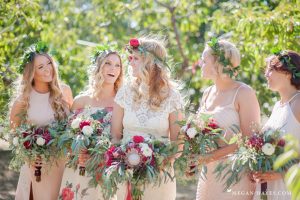 bohemian-bridesmaids-wearing-mismatched-dresses-while-bride-wears-open-back-lace-gown